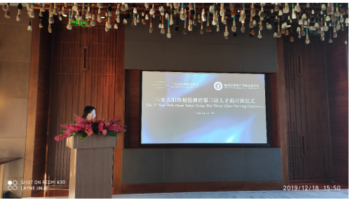 2019年12月18日下午,旅游學院酒店管理專_x0008_業第叁屆國際柏悅人才班在太陽灣柏悅酒店會議廳舉辦隆重的開班儀式。開班儀式由柏悅酒店人事總監項紅娟女士主持,酒店總經理、各部門總監、旅游學院副院長陳德廣、酒店管理系主任金磊、第叁屆柏悅班班主任楊經梓以及全體第叁屆柏悅班學員出席了開班儀式。